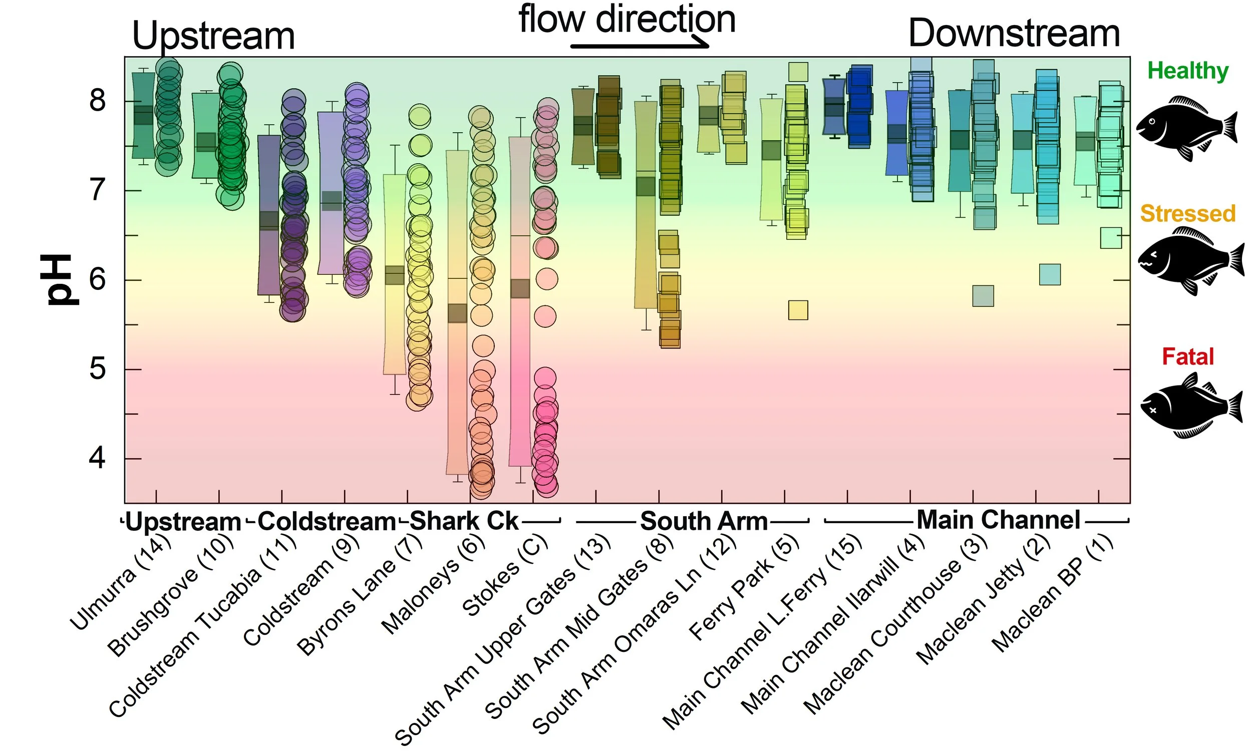 Animation of changes in pH and dissolved oxygen over time at four sites (Main Channel; Coldstream; Shark Creek; Byrons Lane):