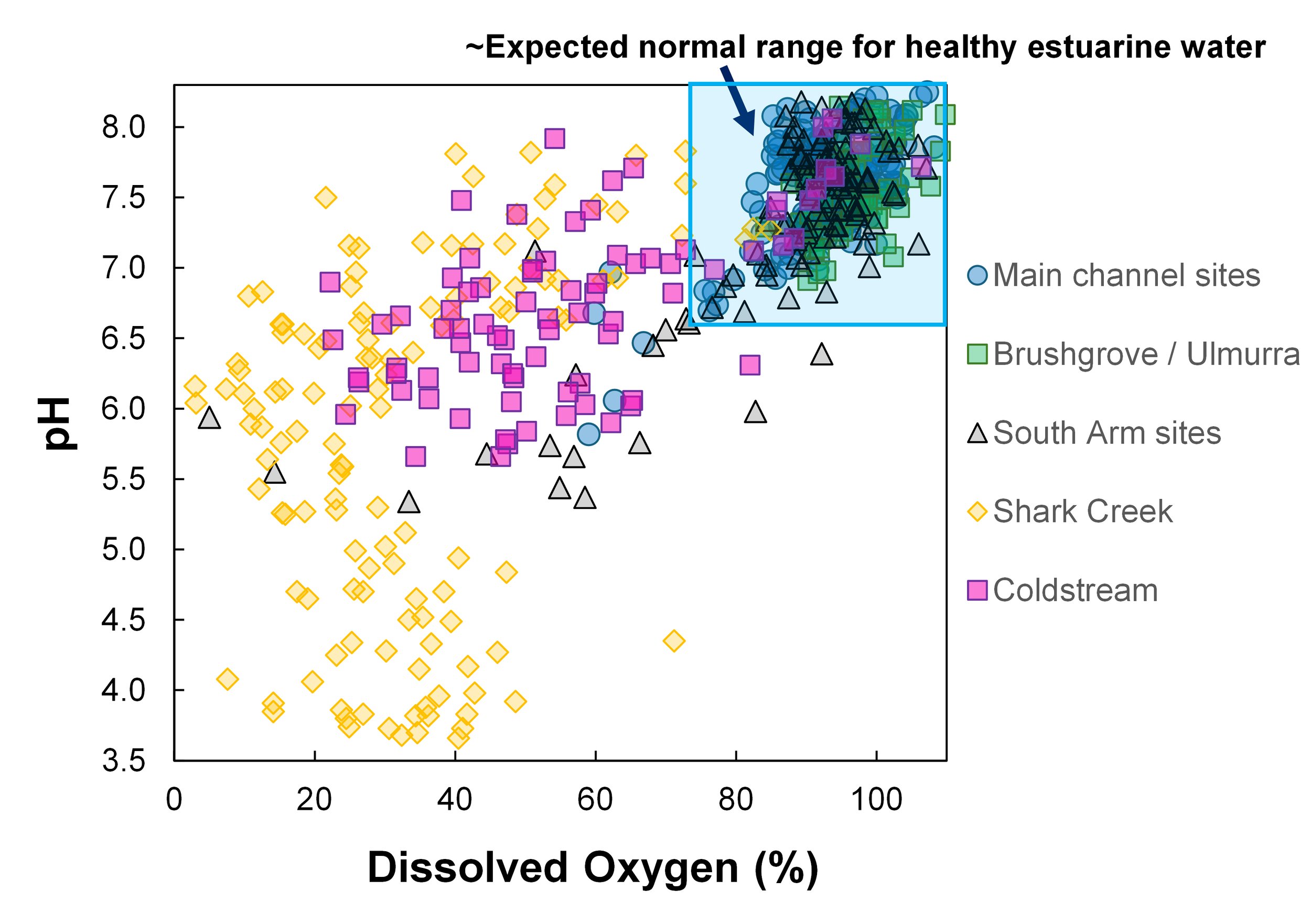 Importantly, the effects of acid sulfate soils on water chemistry in the South Arm appears to persist for many weeks after rainfall has ceased.